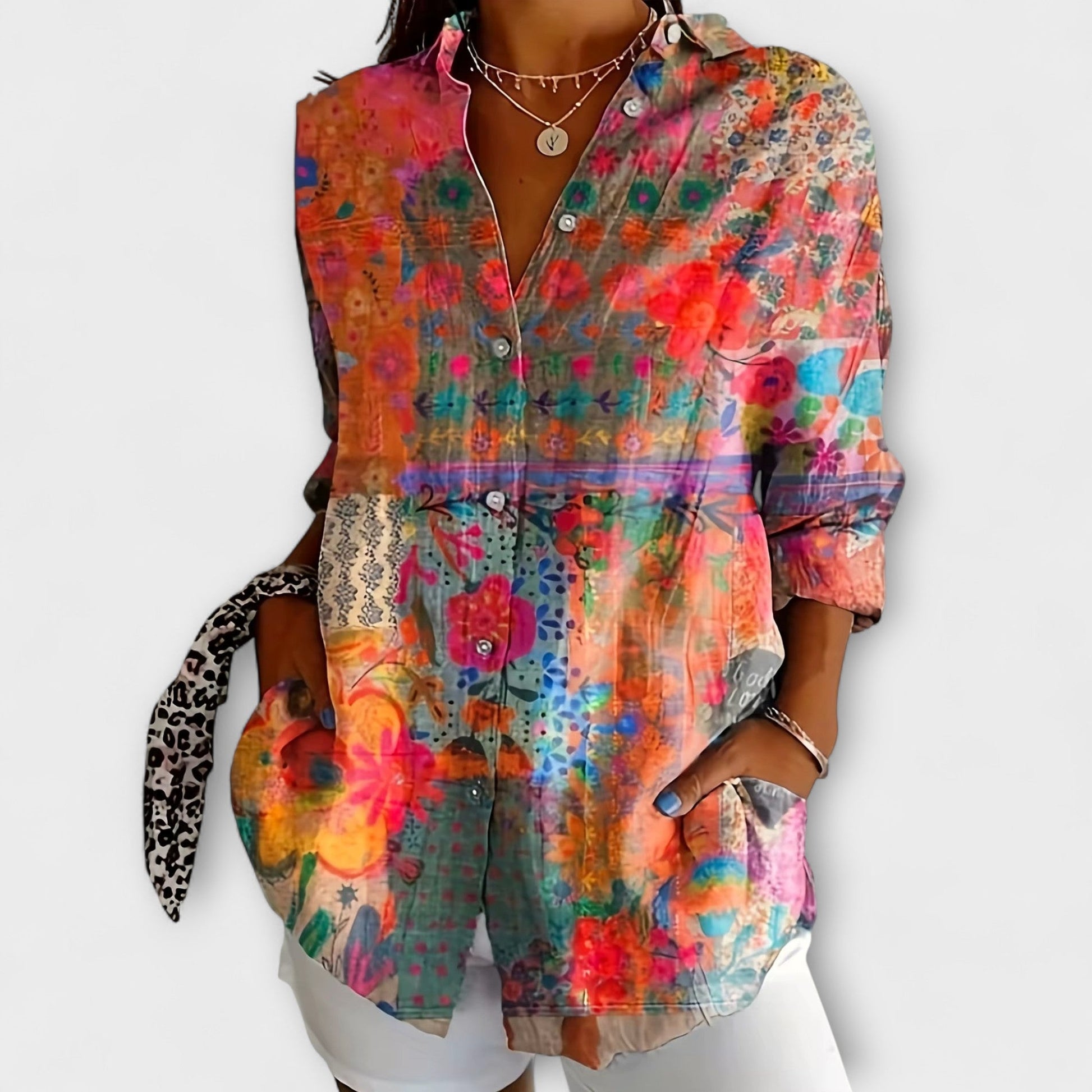 Η αβίαστη μποέμικη γοητεία συναντά την καθημερινή άνεση. Αυτή η αέρινη μπλούζα διαθέτει χαλαρή εφαρμογή και λεπτά σχέδια, κάνοντάς την την τέλεια επιλογή για ζεστές μέρες ή στρωτές εμφανίσεις. Είτε συνδυαστεί με τζιν είτε με φούστες, προσθέτει μια αίσθηση ελεύθερης κομψότητας στη γκαρνταρόμπα σας.